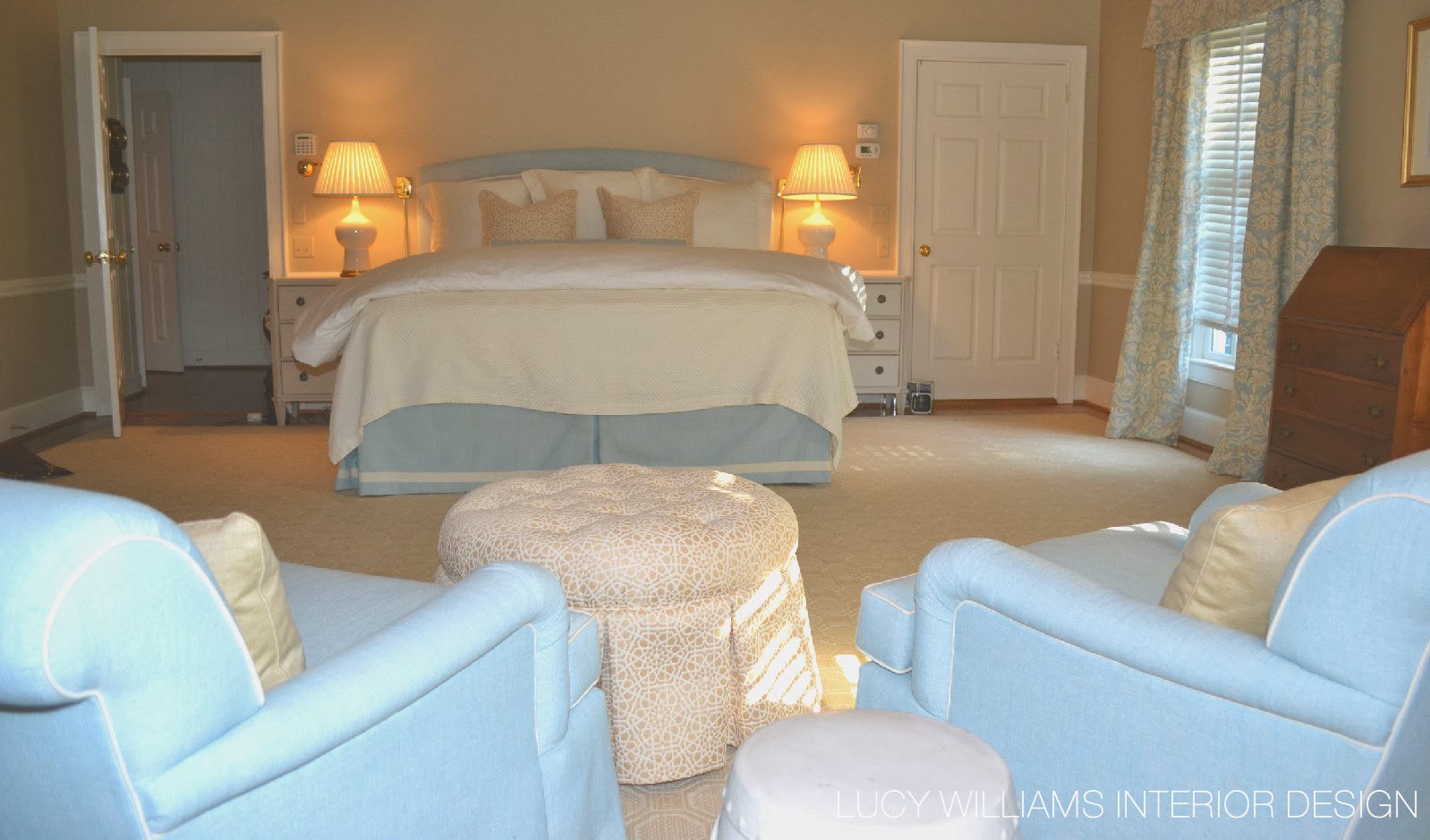 THIS BEDROOM IS A VERY LARGE SPACE AND A COZY SEATING VIGNETTE WAS A MUST. WE ADDDED 2 CLUB CHAIRS AND AN OTTOMAN.